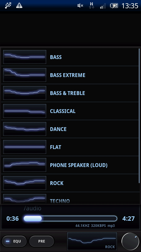 左の写真の設定画面は、「メニューキー」→「EQUALIZER」か、プレーヤ画面右下をタップで切り替わります。