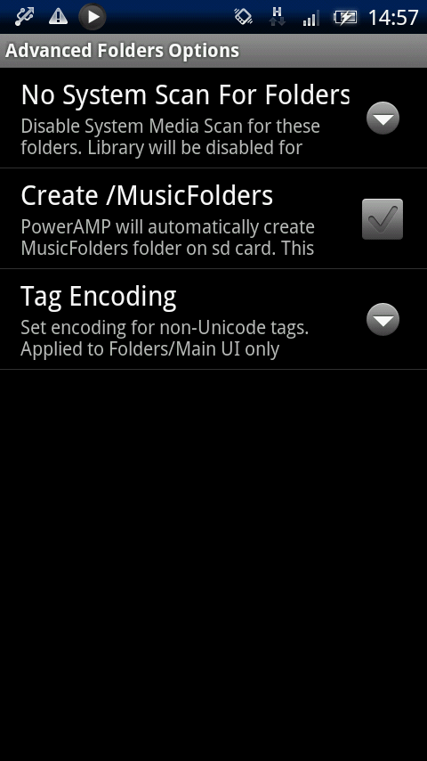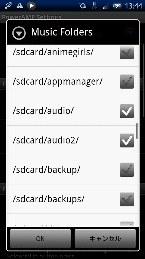 「メニューキー」→「SETTINGS」→「Music Folders」から設定可能。音楽ファイルの入っているフォルダにチェックを付けます。