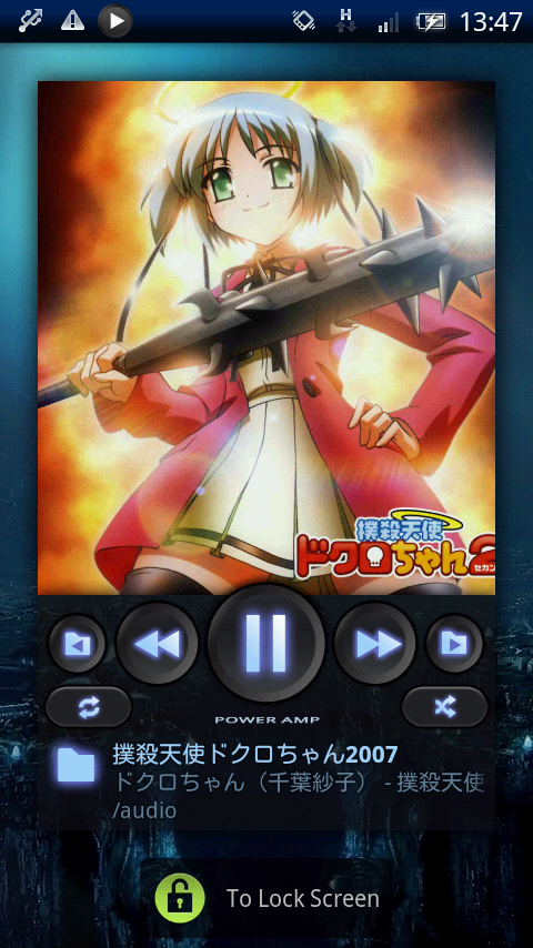 「Lock Screen Widget」にチェックを付けると、音楽再生中は画面ONでプレーヤ画面になり(ちょっとラグあります)、下にある「To Lock Screen」で通常のロック解除画面に移行。