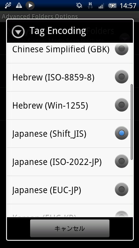 「メニューキー」→「SETTINGS」→「Advanced Folders Options」→「Tag Encoding」から、「Japanese(Shift_JIS)」を選択すれば解決するハズです。